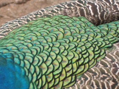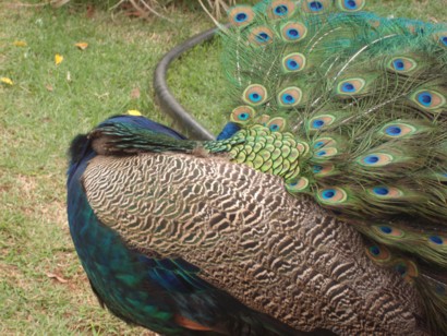 Feather Designs Peacock's walk around loose at the Honolulu Zoo which is the one of the most fascinating places to visit in Hawaii, with Sumatran tigers and, zebras, rare birds including kookaburra (remember the song: kookaburra sits on the old oak tree, eating all the gum drops it can see, laugh kookaburra, laugh kookaburra, save some there for me, ha, ha, ha!) and makes the strangest bird call that permeates the entire zoo, flamingos, giraffes, hippos, apes, hyenas, and many others, along with a children's petting zoo. We can observe, through a glass window, the hippos swimming underwater. We can watch the apes playing a serious, but fun game that looks quite similar to football (but without the ball). We also see them kiss, fight, attack other animals (birds or cats), and relate to each other as a tribe. As our closest relatives, the apes show us that we have not changed as much as we should, and much of our behavior is, in fact, biological, but with an advanced mind to overcome and discipline. The must-see attractions are the apes and Sumatran tigers, but you have to be patient and wait until they come out for their natural performance to show us their unique diversity. The zoo has a special price at multiple levels available for residents, and it is a great place to have lunch and connect to the diversity of life. It has healing properties to teach us, perhaps, nonconsciously, that we are not masters over all, but are one with nature, and we will only find happiness when we are caretakers of all life, but masters over none. What sets humans apart from apes is our intelligence, but which we have not yet learned how to use as a matter of survival. Instead, because of drugs (including unnecessary medicine), our intelligence has been disrupted, and we are primarily functioning as a society of addicted hairless apes (human body but same behavior as chimpanzees) who lack self-discipline and wisdom. Just across the street is the Aquarium that has a diverse display of all kinds of fish, but since they are more expensive and have no yearly pass, I could not afford to go there, but once.