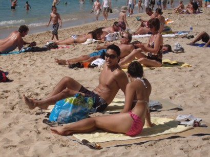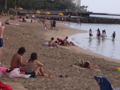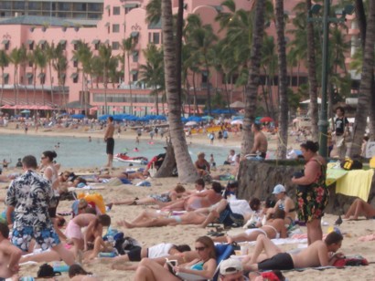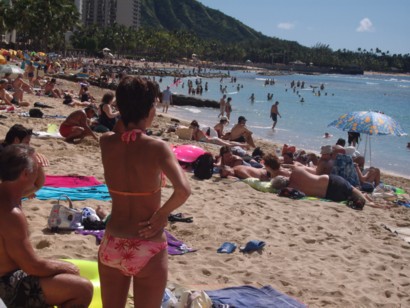 WAIKIKI BEACH January 9, 2009. The tourists packed Waikiki Beach today with tremendous after holiday travel deals. Also, the International Market Place in Waikiki is having steep sales in every booth from tee-shirts to hats to necklaces and dragon statues. _________________________