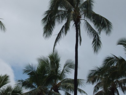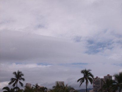 F 12:30 p.m. Saturday: Intermittent rain with blue spectrum struggling to see through the dense clouds. Rain at time is heavy. The Ala Wai has turned muddy which means that there is heavy rain from other parts of the Oahu island washing dirt into the Ala Wai which empties into the Pacific Ocean. Although many tourists are in Waikiki, the beach is rained out so far, but with hope that the blue spectrum will prevail this afternoon.