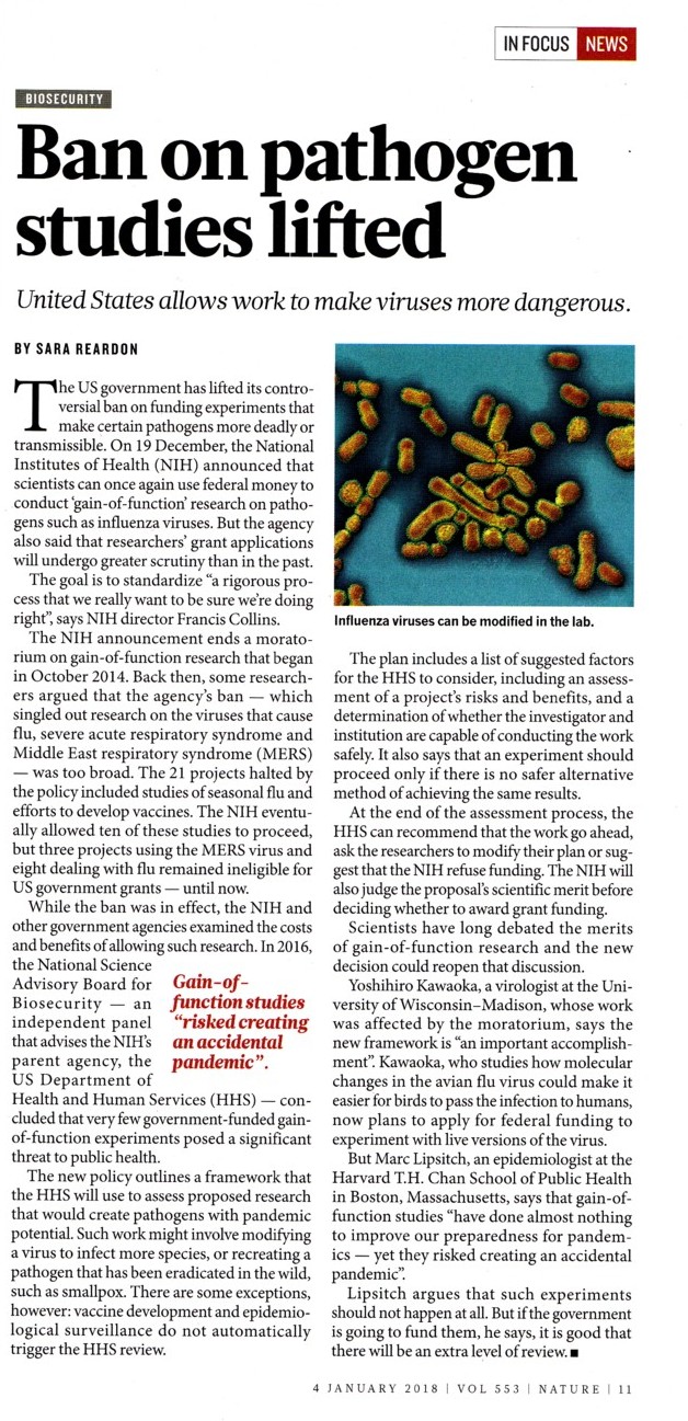 federal approval of Kawaoka’s research was “less transparent