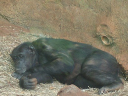 Ape Sleeping 2008. The closest species to humans gives clues to our biological drives. They practice warfare as a challenging game of power. We evolved from the same ancestor as this ape. Our same ancestor passed on this biological drive to us and we dutifully fight wars as the primitive mind dictates. We have the Wisdom to end it -- or do we? Perhaps we, the "hairless apes," have not yet evolved to humans. Are you a hairless ape or a human being? Is the ape in you sleeping or is it awake and controlling your mind? You have the power to overcome your biological drives. That . . . is the purpose of the brain.
