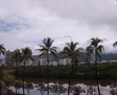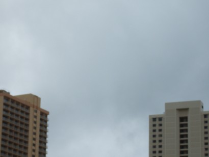 F 12:30 p.m. Saturday: Intermittent rain with blue spectrum struggling to see through the dense clouds. Rain at time is heavy. The Ala Wai has turned muddy which means that there is heavy rain from other parts of the Oahu island washing dirt into the Ala Wai which empties into the Pacific Ocean. Although many tourists are in Waikiki, the beach is rained out so far, but with hope that the blue spectrum will prevail this afternoon.